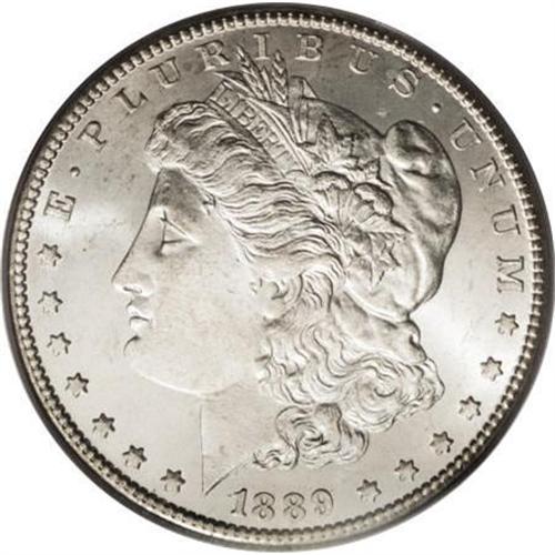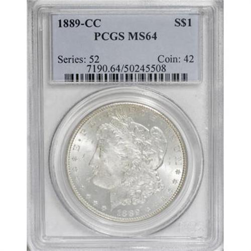 <B>1889-CC $1 MS64 PCGS.</B></I> The 1889-CC is the king of the Carson City Morgan dollars. The 1881-CC and 1885-CC have lower mintages, but are far more plentiful in Mint State, principally due to the GSA hoard. Only a single 1889-CC was present in the GSA holdings. The 1892-CC and 1893-CC also had just one representative in the GSA sales, but are available in Mint State compared to the 1889-CC.<BR>The reason for this is a hoard of Carson City dollars released in 1955. According to the December 1955 Numismatist, The Montana Bank in Great Falls, Montana received a routine shipment of silver dollars from the Minneapolis Federal Reserve Bank, which contained 1,000 1893-CC dollars. The 1955 Treasury dispersal also included 50 bags (per dealer Steve Ruddel) of the 1892-CC.<BR>Some 1889-CC dollars were paid out from the Treasury between the 1920s and 1950s, but most pieces were probably released into circulation in 1889. The Carson City Mint had ceased coinage in 1885, and surplus dollars were likely shipped by rail to San Francisco. Silver dollars may have scarce in Nevada by 1889, when changes in political winds allowed the Mint to resume production.<BR>The typical 1889-CC dollar has XF sharpness but has been cleaned or is otherwise impaired. Examples are found in all circulated grades, and in fact PCGS has certified four pieces as Fair 2. Even low grade examples are coveted by collectors, due to the allure of the Carson City Mint. The 1889-CC becomes very scarce in Mint State, and is essentially uncollectible above the MS64 grade.<BR>PCGS has certified only two such pieces, an MS65 and an MS68.<BR>The present MS64 example is highly attractive for the grade. The cartwheel luster is unbroken, and the light gold toning only affirms the originality. Even the cheek lacks noticeable marks, and the central strike is good, with only minor incompleteness on the hair above the ear. A trace of a fingerprint on the reverse at 6:30 is of no importance. This high end near-Gem is certain to be cherished by its fortunate next owner.<BR><I>From The #3 PCGS 'Mile High' Registry Set of Carson City Morgan Dollars.</B></I><BR><BR><B>Coin Engraver:</B> George T. Morgan<BR><BR><b>Shipping:</b> Coins & Currency (<a target="_blank" href="http://www.heritageauctions.com/common/shipping.php">view shipping information</a>)