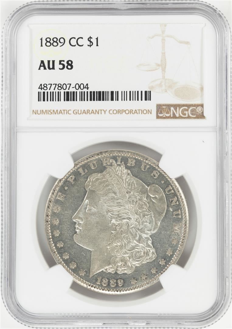 One 1889-CC $1 Morgan Silver Dollar Coin NGC AU58. NGC Certified.