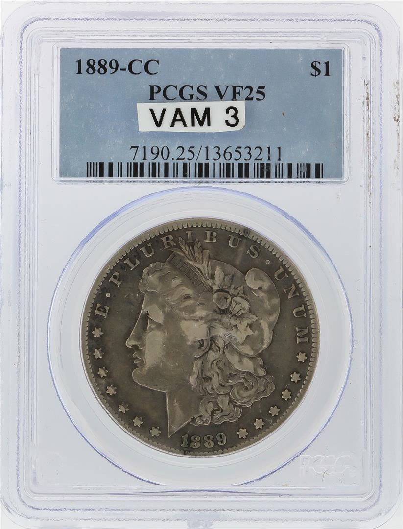 One 1889-CC $1 Morgan Silver Dollar Coin VAM 3 PCGS VF25. PCGS Graded.