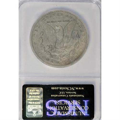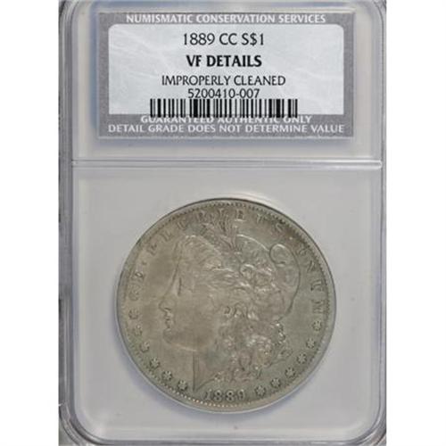 <B>1889-CC $1 --Improperly Cleaned--NCS. VF Details.</B></I> A patch of fine hairlines on the field near the profile confirms a past wipe, but dove-gray and chestnut toning makes helps redeem the eye appeal. The scarcest Carson City Morgan issue.<BR><BR><B>Coin Engraver:</B> George T. Morgan<BR><BR><b>Shipping:</b> Coins & Currency (<a target="_blank" href="http://www.heritageauctions.com/common/shipping.php">view shipping information</a>)