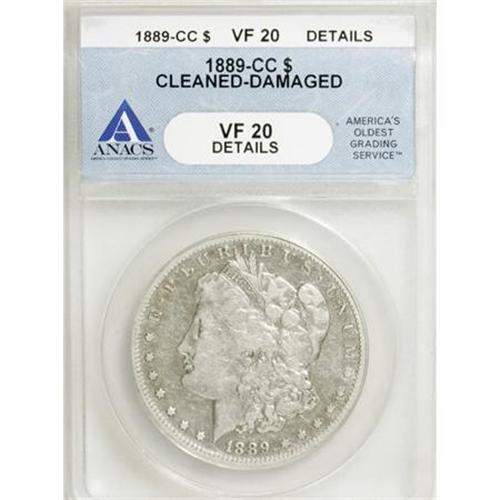 <B>1889-CC $1 --Cleaned, Damaged--ANACS. VF20 Details.</B></I> NGC Census: (131/1720). PCGS Population (186/2342). Mintage: 350,000. Numismedia Wsl. Price for NGC/PCGS coin in VF20: $1,500. (#7190)<BR><BR><B>Coin Engraver:</B> George T. Morgan<BR><BR><b>Shipping:</b> Coins & Currency (<a target="_blank" href="http://www.heritageauctions.com/common/shipping.php">view shipping information</a>)