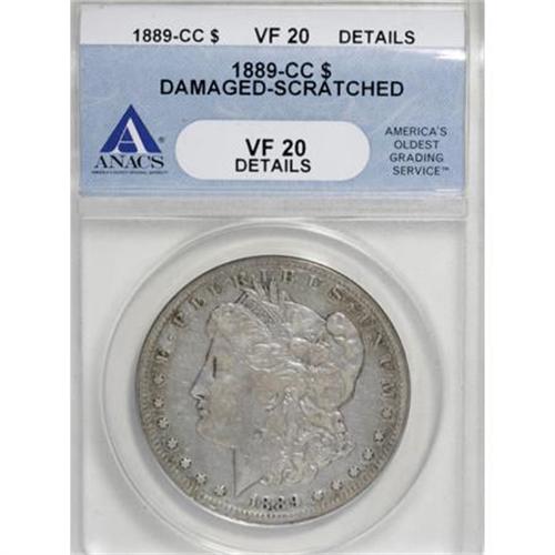 <B>1889-CC $1 --Damaged, Scratched--ANACS. VF20 Details.</B></I> A lightly pinched rim, a few old scratches, and a scrape or two are all hidden beneath natural light gray toning, with delightful gold and iridescent toning.<BR><BR><B>Coin Engraver:</B> George T. Morgan<BR><BR><b>Shipping:</b> Coins & Currency (<a target="_blank" href="http://www.heritageauctions.com/common/shipping.php">view shipping information</a>)