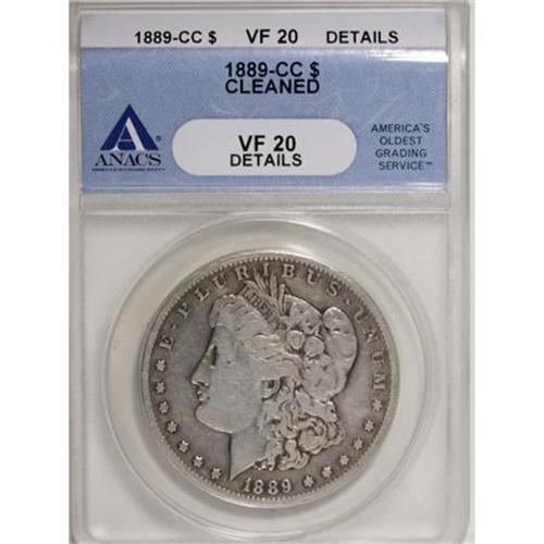 <B>1889-CC $1 --Cleaned--ANACS. VF20 Details.</B></I> A slate-gray key-date CC-mint dollar with glimpses of golden-brown along the borders. Cloudy from hairlines and slightly glossy, but much hair and plumage detail remains, and the portrait is only moderately abraded.<BR><BR><B>Coin Engraver:</B> George T. Morgan<BR><BR><b>Shipping:</b> Coins & Currency (<a target="_blank" href="http://www.heritageauctions.com/common/shipping.php">view shipping information</a>)