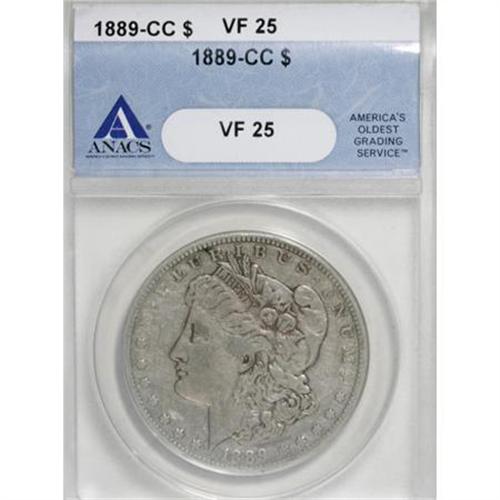 <B>1889-CC $1 VF25 ANACS.</B></I> Light gray surfaces with traces of darker patina around some of the obverse devices.<BR><BR><B>Coin Engraver:</B> George T. Morgan<BR><BR><b>Shipping:</b> Coins & Currency (<a target="_blank" href="http://www.heritageauctions.com/common/shipping.php">view shipping information</a>)