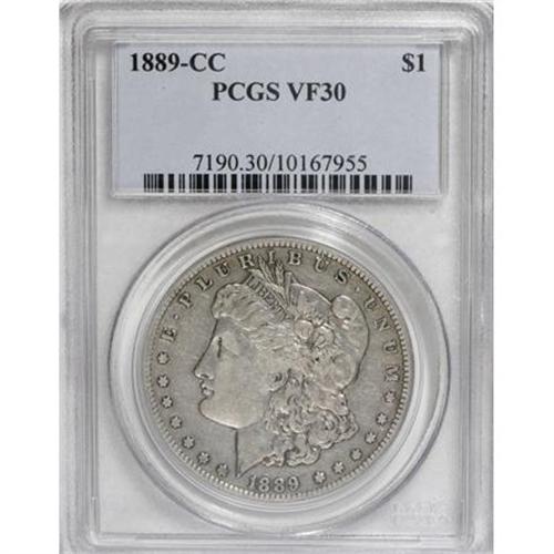 <B>1889-CC $1 VF30 PCGS.</B></I> Though a number of earlier Carson City dollar issues had lower mintages, most such pieces never saw circulation, while many 1889-CC dollars served in the channels of commerce. This moderately worn piece has a touch of lemon-gold patina in the cloud-gray fields, which retain tiny remnants of luster. Highly appealing.<BR><BR><b>Shipping:</b> Coins & Currency (<a target="_blank" href="http://www.heritageauctions.com/common/shipping.php">view shipping information</a>)