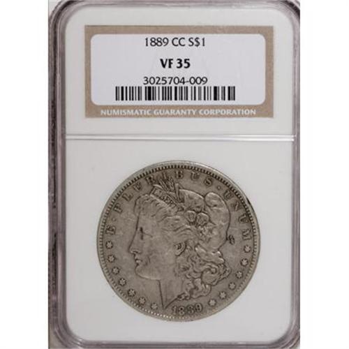 <B>1889-CC $1 VF35 NGC.</B></I> Gunmetal gray surfaces display deeper color in the recessed areas, making the remaining details pop more than they would on a coin with lighter coloration. Two minor rim bumps are noted on the obverse rim at 2 o'clock, but overall the surfaces are very clean and the eye-appeal exceeds many examples of this issue in XF that this cataloguer has seen. <BR><BR><B>Coin Engraver:</B> George T. Morgan<BR><BR><b>Shipping:</b> Coins & Currency (<a target="_blank" href="http://www.heritageauctions.com/common/shipping.php">view shipping information</a>)