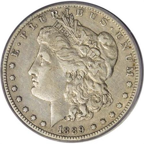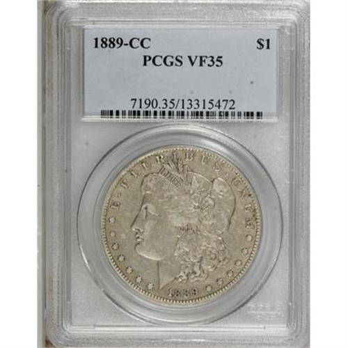 <B>1889-CC $1 VF35 PCGS.</B></I> This piece is struck from the most common obverse die for this key coin, with a straight die line between the maple leaf and the nearby corn shuck. Steel-gray surfaces show tinges of gold, with no singular impairments. A popular grade for this important, low mintage Carson City issue.<BR><BR><B>Coin Engraver:</B> George T. Morgan<BR><BR><b>Shipping:</b> Coins & Currency (<a target="_blank" href="http://www.heritageauctions.com/common/shipping.php">view shipping information</a>)