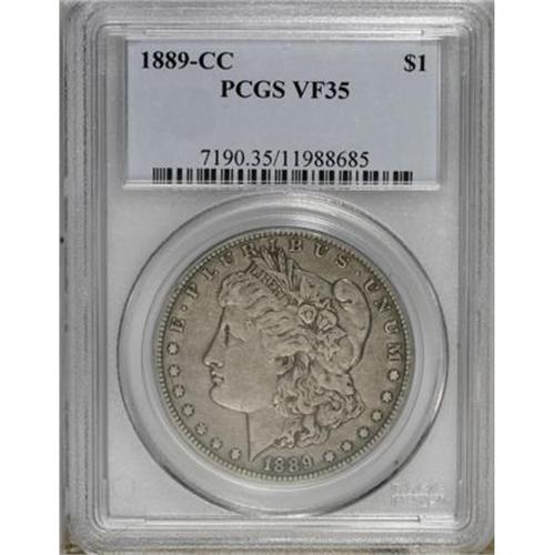 <B>1889-CC $1 VF35 PCGS.</B></I> A dove-gray example of this perpetually popular Carson City key. Liberty's hair and the eagle's breast display the expected moderate wear, but glimpses of luster remain in protected areas. Careful study beneath a loupe locates left obverse hairlines and faded scratches near the eagle's neck and other areas.<BR><BR><B>Coin Engraver:</B> George T. Morgan<BR><BR><b>Shipping:</b> Coins & Currency (<a target="_blank" href="http://www.heritageauctions.com/common/shipping.php">view shipping information</a>)