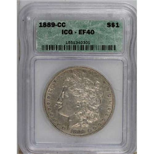 <B>1889-CC $1 XF40 ICG.</B></I> Traces of luster reside in the protected areas of this key date Carson City representative, and a film of champagne-gold color shows over each side. The design elements are well defined, and the few minute marks scattered about are not out of the ordinary for a coin that has seen some circulation.<BR><BR><B>Coin Engraver:</B> George T. Morgan<BR><BR><b>Shipping:</b> Coins & Currency (<a target="_blank" href="http://www.heritageauctions.com/common/shipping.php">view shipping information</a>)