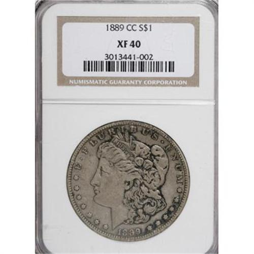 <B>1889-CC $1 XF40 NGC.</B></I> The 1889-CC is an important key-date Carson City issue. David Bowers (2006) writes: "This variety must have circulated extensively ... in the American West, for some worn pieces seen today are in grades such as Good and Very Good." Light golden-gray patina runs over the remarkably clean surfaces of this XF40 example. Sharp detail is apparent for the grade.<BR><BR><B>Coin Engraver:</B> George T. Morgan<BR><BR><b>Shipping:</b> Coins & Currency (<a target="_blank" href="http://www.heritageauctions.com/common/shipping.php">view shipping information</a>)