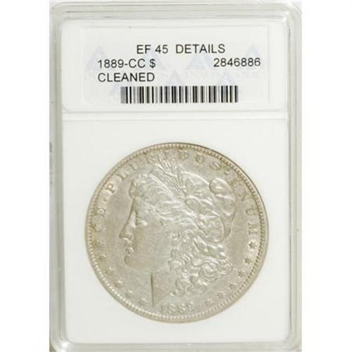 <B>1889-CC $1 --Cleaned--ANACS. XF45 Details. </B></I> The 1889-CC is a well known key date in the Morgan dollar series. As such, it enjoys special status in the numismatic marketplace, and high grade examples sell for princely sums. This more affordable representative has a pleasing appearance that includes essentially full remaining details on the various design features, allowing for some relatively modest highpoint wear. Pale cream color adorns both sides. Severe marks are not evident, but a few small abrasions and scattered hairlines limit the grade. <BR><BR><B>Coin Engraver:</B> George T. Morgan<BR><BR><b>Shipping:</b> Coins & Currency (<a target="_blank" href="http://www.heritageauctions.com/common/shipping.php">view shipping information</a>\)