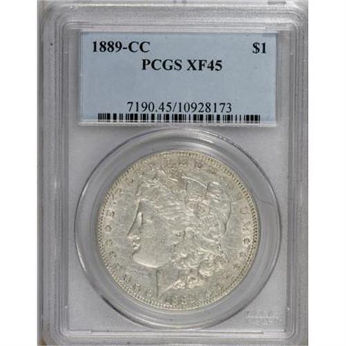 <B>1889-CC $1 XF45 PCGS.</B></I> This Choice XF '89-CC dollar displays pleasing silvery surfaces that retain traces of luster in the areas around and in the interstices of the design elements. The motifs are nicely defined, save for the light wear on the highpoint areas. The few light marks scattered about are not out of line with what would be expected for a coin seeing light circulation.<BR><BR><B>Coin Engraver:</B> George T. Morgan<BR><BR><b>Shipping:</b> Coins & Currency (<a target="_blank" href="http://www.heritageauctions.com/common/shipping.php">view shipping information</a>)