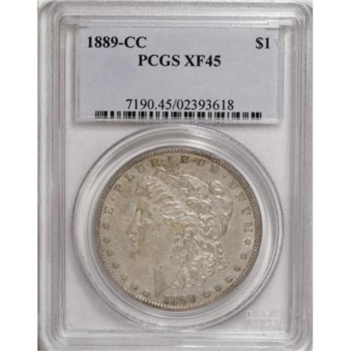 <B>1889-CC $1 XF45 PCGS.</B></I> This is a satiny, lightly worn example with bluish-gray surfaces only show a few small abrasions. An isolated dig, on Liberty's neck just below the jawline, is the only singularly noteworthy abrasion. This issue's low mintage of 350,000 pieces, along with a relatively small percentage of survivors, has virtually guaranteed its key date status. <BR><BR><B>Coin Engraver:</B> George T. Morgan<BR><BR><b>Shipping:</b> Coins & Currency (<a target="_blank" href="http://www.heritageauctions.com/common/shipping.php">view shipping information</a>)