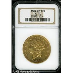 <B>1889-CC $20 AU50 NGC.</B></I> The shimmering bright luster is particularly pervasive on the reverse. A richly detailed representative, impressive for its lack of obtrusive contact marks. A mere 30,945 pieces were struck. Lot:9208