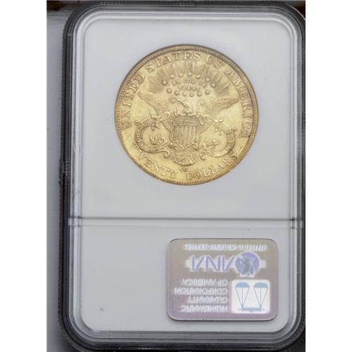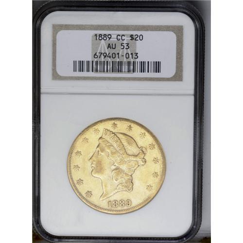 <B>1889-CC<$20> AU53 NGC.</B></I> Obverse stars 5 and 6 are softly struck, as are the obverse denticles near 10 o'clock. The remaining details are adequately formed, revealing minimal highpoint wear on each side. The coloration is a variegated mix of green-gold and apricot, and small abrasions are scattered over both sides.