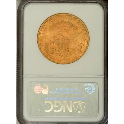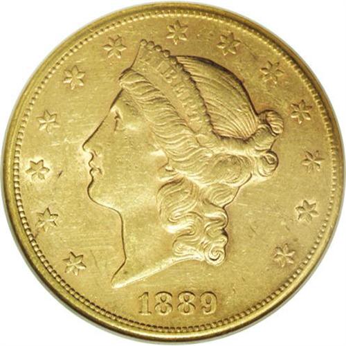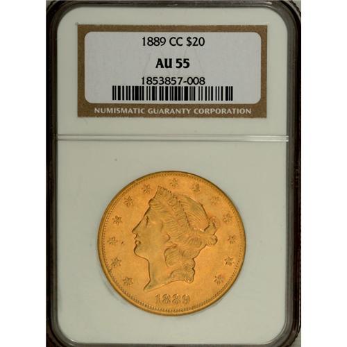 <B>1889-CC $20 AU55 NGC.</B></I> The surfaces of this greenish-gold example have matte-like luster with traces of pale orange toning on both sides. Although not a rare date, this issue seems to garner considerable visibility due to the rarity of the similarly dated Morgan dollar issue.<BR><BR><b>Shipping:</b> Coin/Currency (<a target="_blank" href="http://www.heritageauctions.com/common/shipping.php">view shipping information</a>)