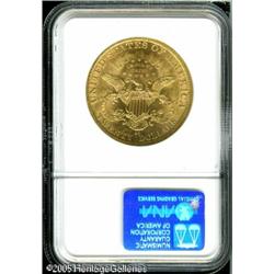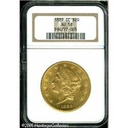<B>1889-CC $20 AU58 NGC.</B></I> A moderately scarce Carson City twenty. This specimen retains nice detail, with most of Liberty's hair strands and curls, the star centers, and all of the eagle's feathers well defined. The surfaces are peach-gold in color, and reveal nice residual luster. Scattered bag marks are noted on each side, with a few more noticeable ones occurring on Liberty's cheek and neck.<BR><I>From The Richard J. Chouinard Collection of United States Coins, Part Two.</B></I> Lot:9210