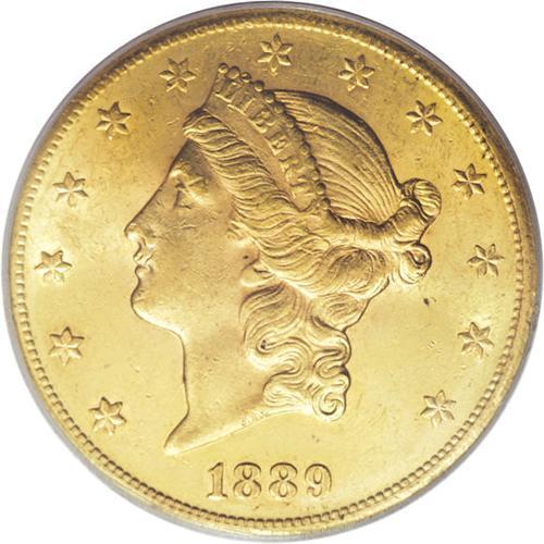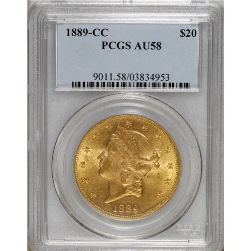 <B>1889-CC $20 AU58 PCGS.</B></I> Perhaps assisted by the importance of the 1889-CC dollar, the double eagle of the same date and mintmark has become a popular coin among collectors. It is easily obtainable in circulated condition; however, according to Douglas Winter and Lawrence Cutler in their <I>Gold Coins of the Old West, The Carson City Mint,</B></I> it is doubtful "if any 1889-CC double eagle is currently known above MS63." Considering this fact, the purchase of an eye-appealing near-Mint State example presents an easily acceptable compromise for even the most discerning collector. The current AU58 example provides such an opportunity. The striking details are uniformly sharp definition on each side. Also, the mint luster is almost complete, giving this coin much of the appearance of an Uncirculated example.<BR><BR><b>Shipping:</b> Coins & Currency (<a target="_blank" href="http://www.heritageauctions.com/common/shipping.php">view shipping information</a>)