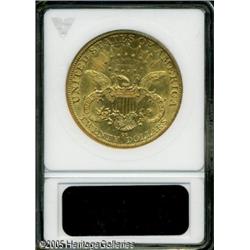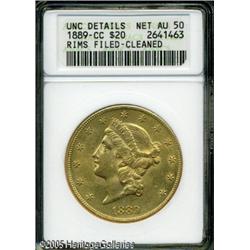<B>1889-CC $20 --Rims Filed, Cleaned--ANACS. Unc Details, Net AU50.</B></I> The obverse field is moderately hairlined, and faint file marks are intermittently present on both rims. Boldly struck and lustrous. A scarcer Carson City issue. Lot:9206