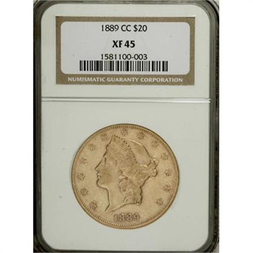 <B>1889-CC $20 XF45 NGC.</B></I> Luster dominates the reverse design, and is prominent about the obverse stars and within Liberty's hair. Impressively void of relevant marks. A low mintage Carson City issue.<BR><BR><B>Coin Engraver:</B> James B. Longacre<BR><BR><b>Shipping:</b> Coins & Currency (<a target="_blank" href="http://www.heritageauctions.com/common/shipping.php">view shipping information</a>)