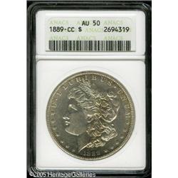 <B>1889-CC<img border='0' src='http://www.heritagecoins.com/images/star.gif' width=10 height=10>$1 AU50 ANACS.</B></I> A lightly circulated example of this rare, key date issue. Both sides are surprisingly free from large or distracting abrasions. The surfaces are a silver-gray color and show a hint of streaky brown color. By far the scarcest Carson City Morgan, particularly in grades above XF.<BR><I>From The Banks Collection.</B></I> Lot:10302