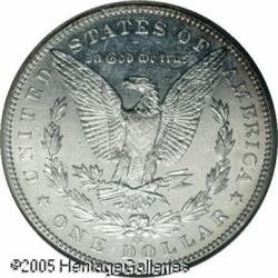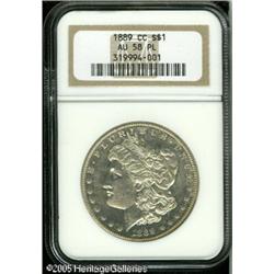 <B>1889-CC<img border='0' src='http://www.heritagecoins.com/images/star.gif' width=10 height=10>$1 AU58 Prooflike NGC.</B></I> Considerable mint luster and some reflectivity are the hallmarks of this high-end, barely circulated piece. The strike is nearly full and there are minor marks on both sides, but none that shout for individual attention. Lot:10308