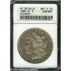 <B>1889-CC<img border='0' src='http://www.heritagecoins.com/images/star.gif' width=10 height=10>$1 --Cleaned--ANACS. VF Details, Net Fine 12.</B></I> The surfaces present a somewhat "washed out" appearance from the cleaning, and are retoning a light reddish-brown on the obverse, and a peripheral lime-green and golden-brown on the reverse. A few light to moderate marks are seen, mostly on the obverse. Lot:10289