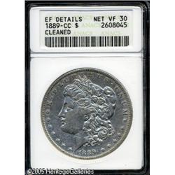 <B>1889-CC<img border='0' src='http://www.heritagecoins.com/images/star.gif' width=10 height=10>$1 --Cleaned--ANACS. XF Details, Net VF30.</B></I> Bright surfaces from an old cleaning, with sharp details for the assigned grade, and no overly distracting marks. One of the top five key dates in the Morgan dollar series. Lot:10294