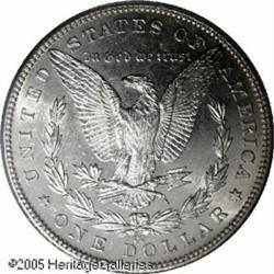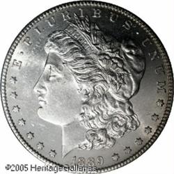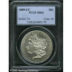 <B>1889-CC<img border='0' src='http://www.heritagecoins.com/images/star.gif' width=10 height=10>$1 MS62 PCGS.</B></I> Even if it wasn't the key date to the Carson City Morgan Dollar issue, this beautiful coin would be a hotly contested item on the bidding floor. Although the insert does not attribute the surfaces as prooflike, the fields are partially reflective and with modest contrast to the frosty devices. Fully struck with good definition even in the usually suspect centers. Despite a few trivial hairlines and small obverse marks, this coin is seemingly conservatively graded.<BR><I>From The Banks Collection.</B></I> Lot:10307