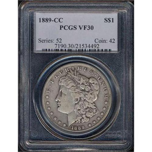<b>1889-CC Morgan Dollar. PCGS graded VF30.</b> Another nicely circulated example of this scarce issue with very smooth surfaces and pleasing light gray color. A coin that is often one of the two or three last pieces acquired when building a circulated collection of Morgan dollars by date and mintmark <b>(PCGS # 7190)</b>