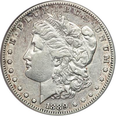 1889-CC Morgan Dollar. PCGS graded EF-45. A pleasing problem-free example. A fully original specimen, uncleaned and with a light overlay of silver-gray color. Close examination reveals some luster in the protected area. Destined for a fine silver dollar collection (PCGS # 7190).