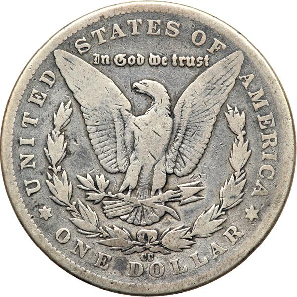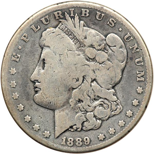 1889-CC Morgan Dollar. PCGS graded Good-6. Evenly toned and worn. Some old marks on the eagle. A popular key date (PCGS # 7190) .