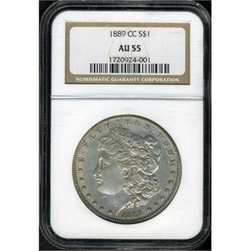 <b>1889-CC Morgan Dollar. NGC graded AU55.</b> Modest wear on this important date dollar makes it a choice problem-free example for the value-oriented collector. The coin retains all but the very highest points of detail, still has good matte silver color, with no contact marks of consequence and only a couple of minor scuffs on the chin. Mintage: 350,000 <b>(PCGS # 7190)</b>