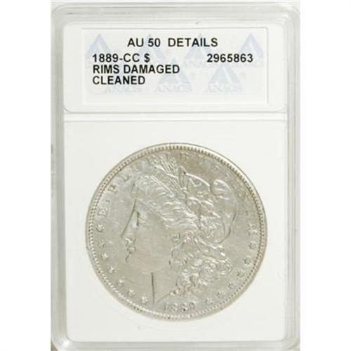 <B>1889-CC $1 --Rims Damaged, Cleaned--ANACS. AU50 Details.</B></I> A small rim cut is visible at the left side of the obverse, and both sides have additional evidence of filing to remove other rim problems, but this well struck coin remains attractive and desirable with bright silver-gray surfaces that retain considerable luster.<BR><BR><B>Coin Engraver:</B> George T. Morgan<BR><BR><b>Shipping:</b> Coins & Currency (<a target="_blank" href="http://www.heritageauctions.com/common/shipping.php">view shipping information</a>)