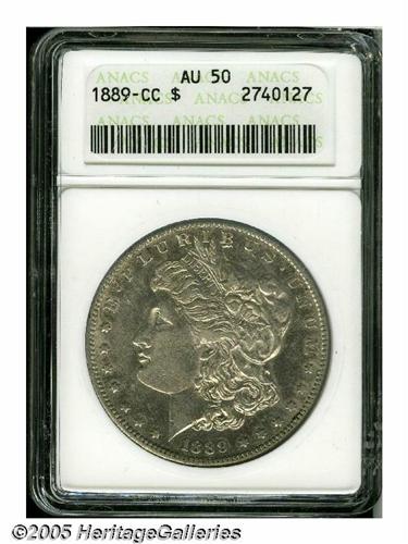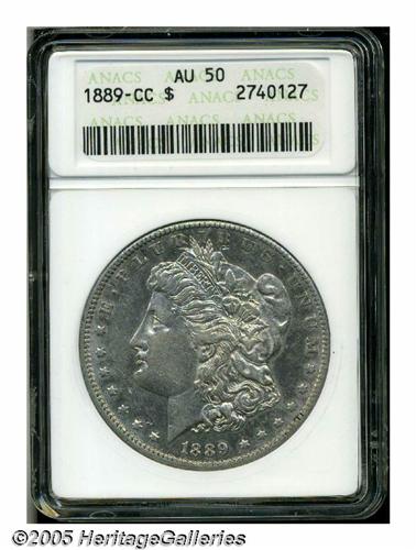 <B>1889-CC<S$1> AU50 ANACS.</B></I> A lightly circulated example of this rare, key date issue. Both sides are surprisingly free from large or distracting abrasions. The surfaces are a silver-gray color with deeper gray accents in the fields, and show some remaining, underlying prooflikeness. By far the scarcest Carson City Morgan, particularly in grades above XF.