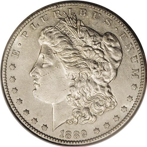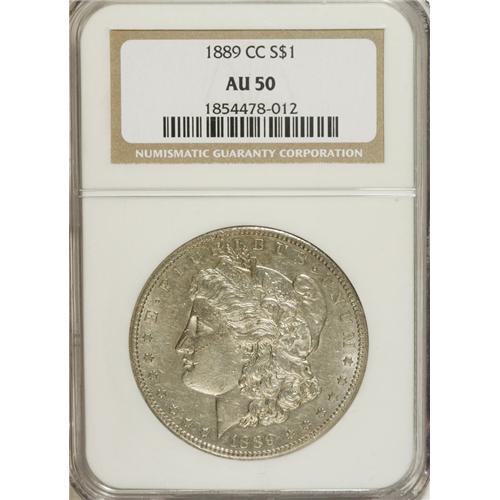 <B>1889-CC S$1 AU50 NGC.</B></I> The 1889-CC is one of the keys to the series, and is the rarest and most desired issue among Carson City Morgans. This untoned AU50 specimen displays traces of luster in the protected areas, and shows a good amount of detail on the design elements. Small contact marks are visible, especially on the obverse, all of which are within the context of the grade.<BR><BR><b>Shipping:</b> Coins & Currency (<a target="_blank" href="http://www.heritageauctions.com/common/shipping.php">view shipping information</a>)