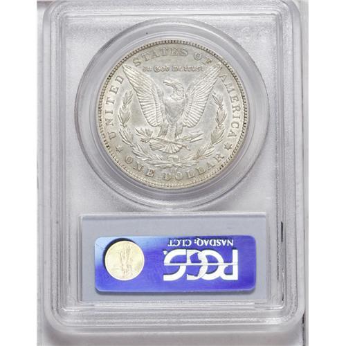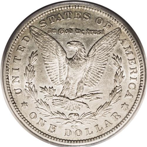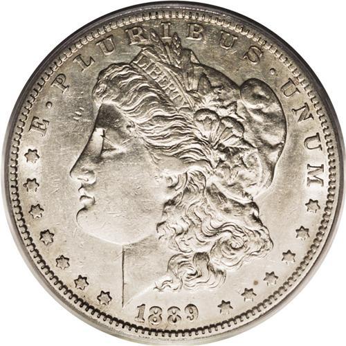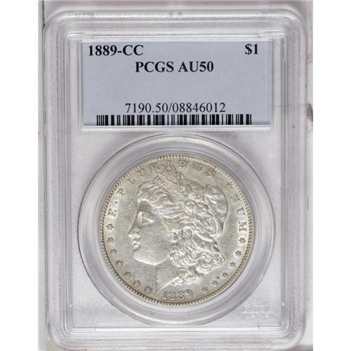 <B>1889-CC<img border='0' src='http://www.heritagecoins.com/images/star.gif' width=10 height=10>$1> AU50 PCGS.</B></I> After a three year intermission since the coinage of 1885, the Carson City Mint renewed production in 1889 with coinage limited to silver dollars and double eagles. Only 350,000 Morgan dollars and 30,945 double eagles were coined in that year for a total production of just under $1 million face value. The mintage comparison is interesting as the Morgan dollar had ten times the coinage of the double eagle, yet it is considered a key-date among Carson City Morgan dollars while the double eagle is only considered to be a scarce issue relative to other Carson City double eagles. This example is a splendid representative with light silver-gray surfaces, traces of peripheral gold toning, and considerable remaining luster.