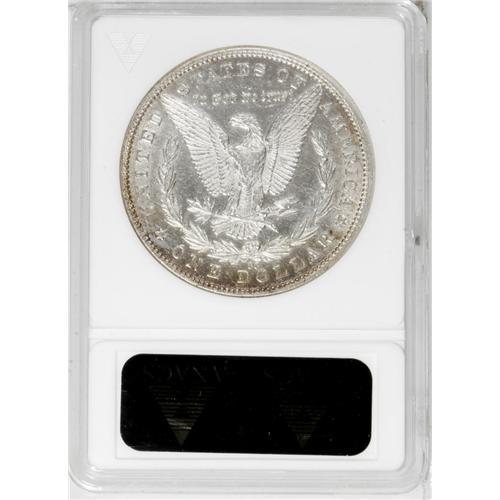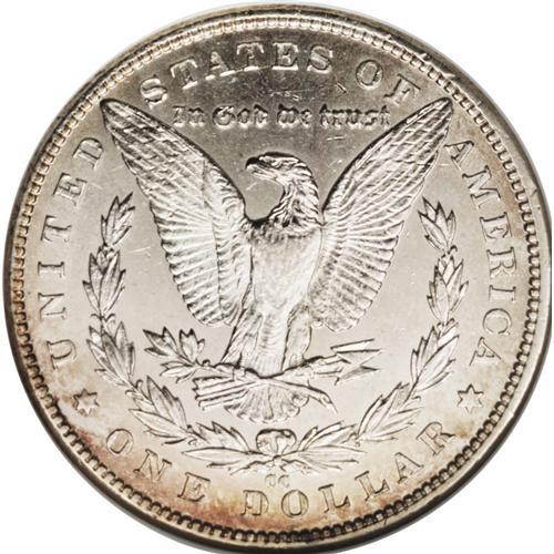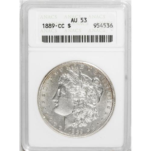 <B>1889-CC<img border='0' src='http://www.heritagecoins.com/images/star.gif' width=10 height=10>$1> AU53 ANACS.</B></I> A pleasing, problem-free example of this most elusive CC-mint Morgan dollar key issue, with gold-accented rims complementing the lustrous silver centers. Light circulation wear shows on the eagle's breast and Liberty's highpoint hair. There are no mentionable impairments, however, even though a loupe reveals light hairlines and minuscule abrasions. An appealing coin for the grade.