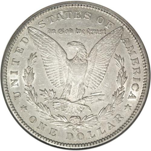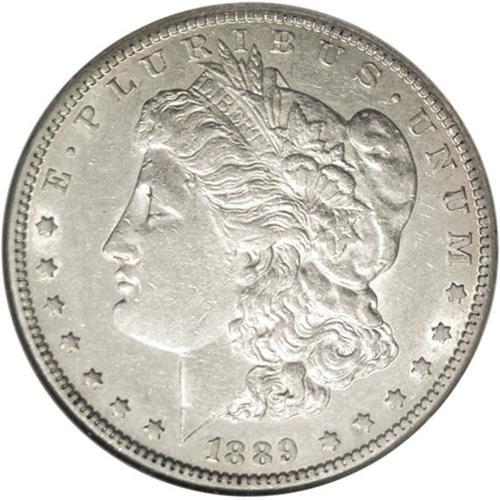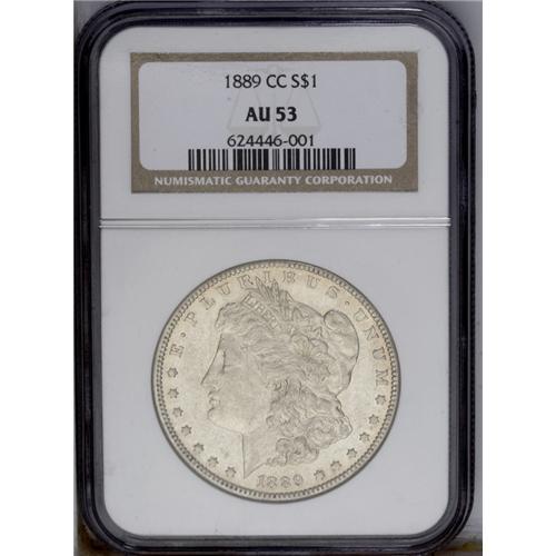 <B>1889-CC<img border='0' src='http://www.heritagecoins.com/images/star.gif' width=10 height=10>$1 AU53 NGC.</B></I> An attractive example of this key date. A number of small marks on the obverse do not detract from the desirability. Rare due to the low mintage and few survivors found, with any decent example eagerly sought-after by Morgan dollar collectors. Partially lustrous fields.