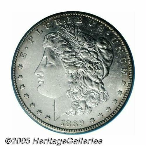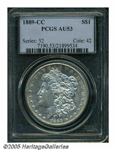 <B>1889-CC<S$1> AU53 PCGS.</B></I> Modest wear on this important date Dollar makes it a nice, problem-free example for the budget-minded collector. The coin retains all but the very highest points of detail, still has good silver color, with no contact marks of consequence.