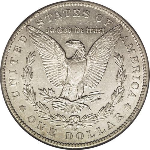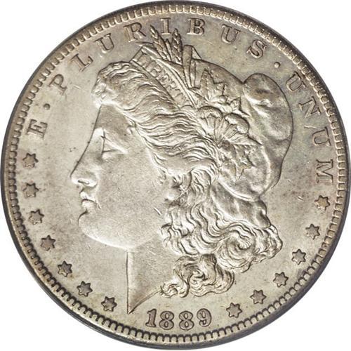 <B>1889-CC<img border='0' src='http://www.heritagecoins.com/images/star.gif' width=10 height=10>$1> AU55 ANACS.</B></I> This 1889-CC example, a representative of the most desired issue among Carson City Morgan dollars, displays a thin veneer of pretty champagne patina, overlain with blushes of powder-blue on the obverse. Luster resides in the recesses, and well defined motifs are the rule, except for softness in the hair over Liberty's ear and portions of the eagle's breast. A few minute marks on the cheek are unworthy of individual mention.