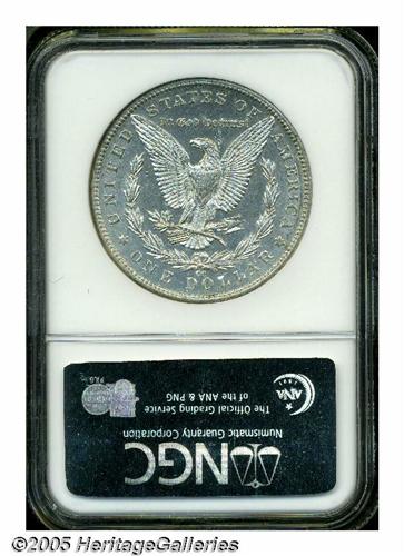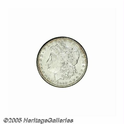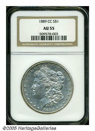 <B>1889-CC<S$1> AU55 NGC.</B></I> A lightly worn, yet sharply detailed representative of this key date CC-mint Morgan. The surfaces are essentially brilliant with just a hint of peripheral color. A couple of noticeable marks are seen on Liberty's neck and the lower portion of Liberty's cheek.