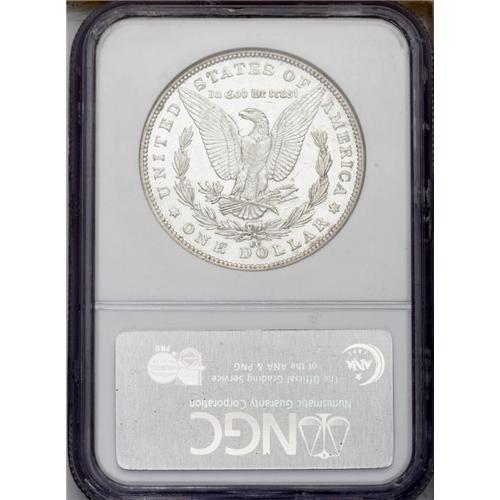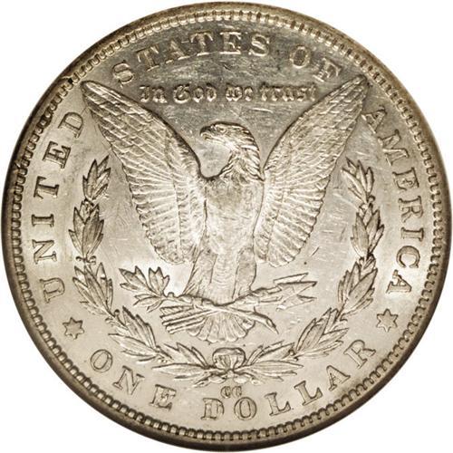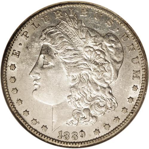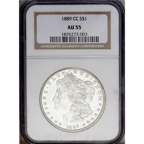 <B>1889-CC<img border='0' src='http://www.heritagecoins.com/images/star.gif' width=10 height=10>$1> AU55 NGC.</B></I> Just the slightest friction is seen on each side of this high grade key date example. Much of the original mint luster is still intact and there is just the slightest bit of color present. Well struck and problem-free for a lightly circulated coin. Sure to be of great interest to advanced Morgan dollar collectors.