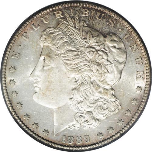 <B>1889-CC<img border='0' src='http://www.heritagecoins.com/images/star.gif' width=10 height=10>$1 AU58 PCGS.</B></I> The fields are fully prooflike on this beautiful and highly coveted Morgan dollar, a coin with the kind of eye appeal that instantly inspires the beholder. There are soft hints of amber, magenta, and steel-blue toning on the peripheries of both sides, and only a slight trace of wear shows. While this issue is often weakly struck, this example is a bit better struck than the typical example, with a pleasing amount of detail on the hair above the ear and on the eagle's breast feathers. This is one of the keys to a Morgan dollar collection, and it is far and away the most elusive of the ever-popular Carson City issues.<BR><I>From The Leslie E. Lunsford Collection, #7 Current Finest Registry Morgan Dollars Basic Set, Circulation Strikes.</B></I>