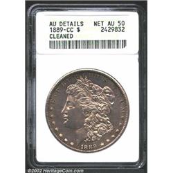 1889-CC S$1--Cleaned--ANACS. AU Details, Net AU50. The fabled 1889-CC is the rarest Morgan Dollar from the Carson City Mint. The present lot offers a more affordable AU survivor. There is very little wear, and, were it not for the impairment, this coin would probably warrant an AU58 designation from one of the major grading services. Virtually every feature is razor sharp, and the surfaces are curiously abrasion-free. A glossy sheen (no doubt from the cleaning) is evident beneath steel-gray toning and copper tinged rim accents.From the Hans Poetsch Collection. Important notice: We expect to be auctioning lots at the rate of 200-250 per hour. Sometimes eBay Premier live bid software cannot keep up with that pace, so we strongly recommend that you place a realistic proxy bid now as insurance to avoid disappointment. Also please note that all Heritage/CAA lots purchased through eBay Premier carry a 20% Buyer's Premium. Please make sure you read the Terms and Conditions.