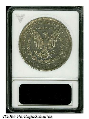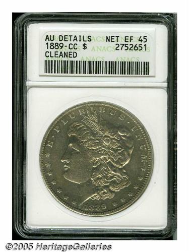 <B>1889-CC<S$1>--Cleaned--ANACS. AU Details, Net XF45.</B></I> A rather abrasive cleaning has stripped away most of the remaining luster, having effectively dulled the surfaces on this lightly circulated Carson City key. Apricot and lilac accents have since formed about the peripheral devices.