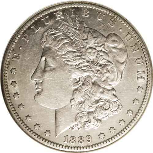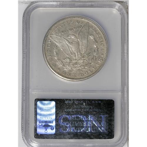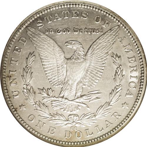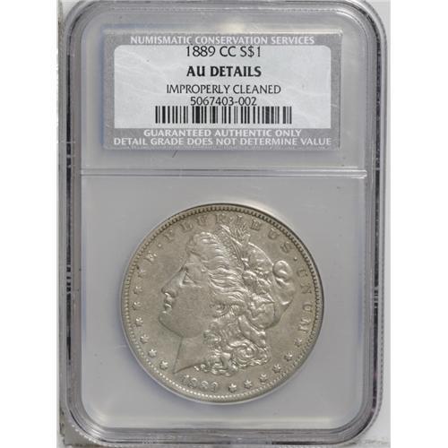 <B>1889-CC<img border='0' src='http://www.heritagecoins.com/images/star.gif' width=10 height=10>$1>--Cleaned--ANACS. AU50 Details.</B></I> Despite light cleaning, this piece retains some of its original luster, and this lightly worn coin still shows evidence of a sharp strike. Partially retoned golden-brown and robin's-egg-blue in the obverse and reverse fields.
