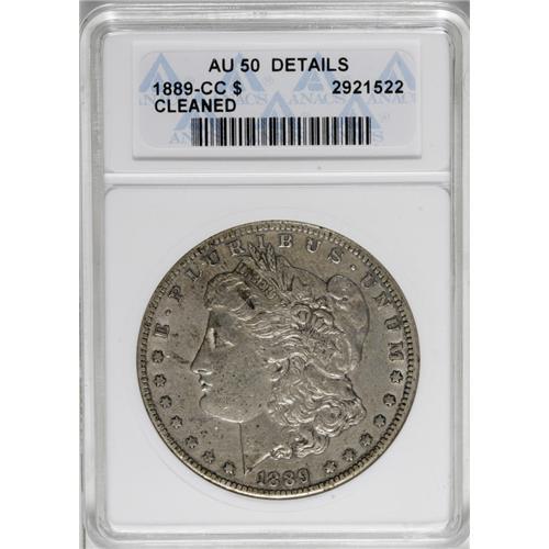 <B>1889-CC S$1 --Cleaned--ANACS. AU50 Details.</B></I> Just a trace of original luster remains on this brown-speckled medium-gray example. Light wear is noted on the softly struck highpoints.<BR><BR><b>Shipping:</b> Coin/Currency (<a target="_blank" href="http://www.heritageauctions.com/common/shipping.php">view shipping information</a>)