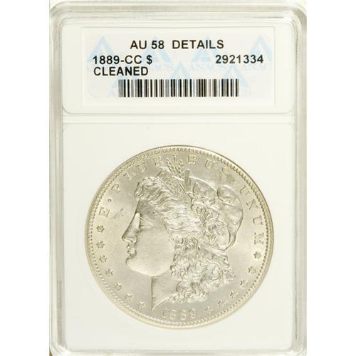 <B>1889-CC S$1 --Cleaned--ANACS. AU58 Details.</B></I> A well struck and untoned key date Carson City dollar that has been dipped one too many times, but nonetheless possesses ample cartwheel sheen. The strike is commanding, and only the experienced eye can detect the hint of friction present on the eagle's breast. There are no notable marks, and the eye appeal is better than suggested by the ANACS insert.<BR><BR><b>Shipping:</b> Coin/Currency (<a target="_blank" href="http://www.heritageauctions.com/common/shipping.php">view shipping information</a>)