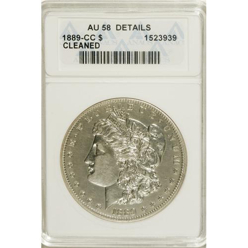 <B>1889-CC S$1 --Cleaned--ANACS. AU58 Details.</B></I> One wonders what this coin would have looked like "unimproved," as it certainly appears not to have needed any betterment via the cleaning that resulted in too-bright surfaces. Other than the unnatural brilliance, the surfaces are almost abrasion-free and show only the most picayune evidence of wear. A bit of golden mellowing is beginning to appear at the rims. This piece, from the most commonly seen of the three obverse dies known, shows the characteristic authenticating straight die line between the maple leaf and the corn shoot to its left.<BR><BR><b>Shipping:</b> Coins & Currency (<a target="_blank" href="http://www.heritageauctions.com/common/shipping.php">view shipping information</a>)